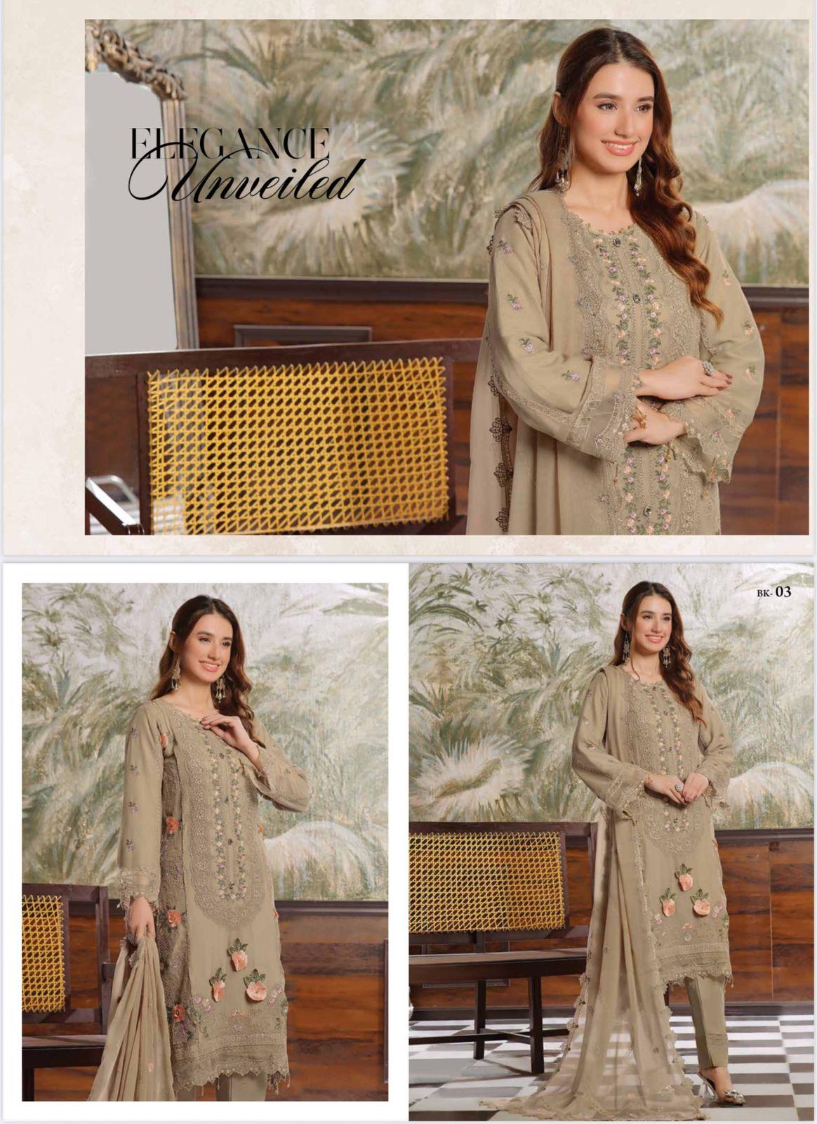 This elegant Pakistani dress features a beautifully designed kameez paired with a matching shalwar and dupatta. Crafted with premium fabric and delicate detailing, it offers both comfort and style—perfect for festive occasions or graceful everyday wear.